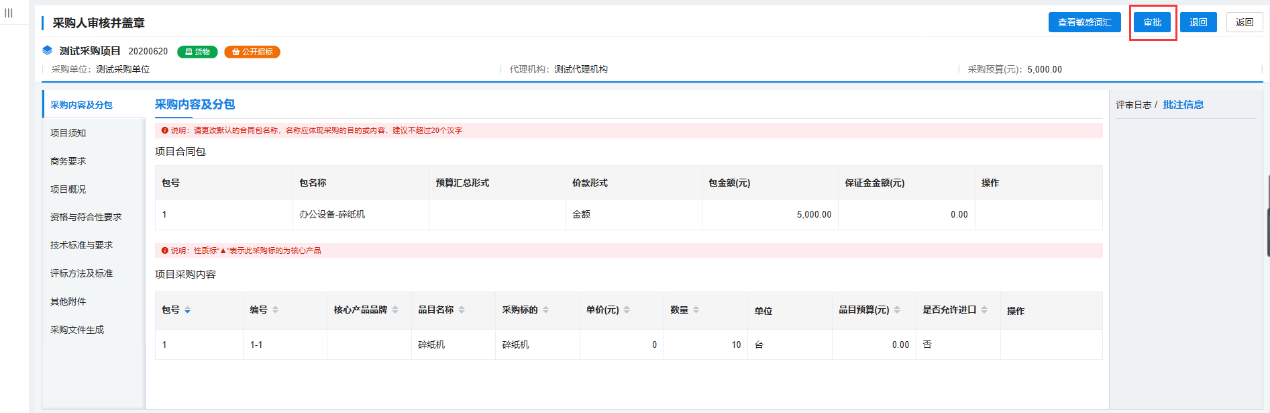 步骤二:确认公告内容无误后,点击【审批】,填写处理审批备注内容(可不填),点击【确定】提交至下一环节(代理机构)。