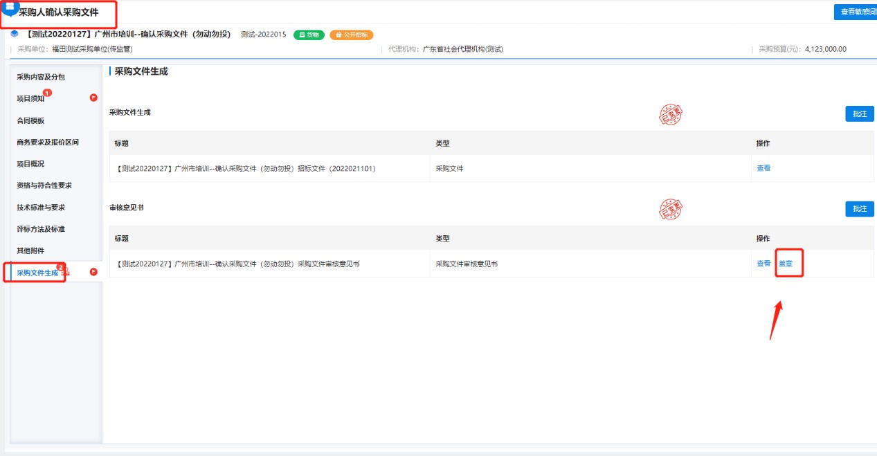**步骤二:**对“修改365bet登录_365bet.com亚洲版_北海365信息分类文件”环节录入的信息以及新生成的365bet登录_365bet.com亚洲版_北海365信息分类文件进行确认,检查信息无误后,点击“365bet登录_365bet.com亚洲版_北海365信息分类文件生成”“查看”365bet登录_365bet.com亚洲版_北海365信息分类人可以对“招标(365bet登录_365bet.com亚洲版_北海365信息分类)文件审核意见书”进行打印。点击“盖章”可对“招标(365bet登录_365bet.com亚洲版_北海365信息分类)文件审核意见书”进行盖章。