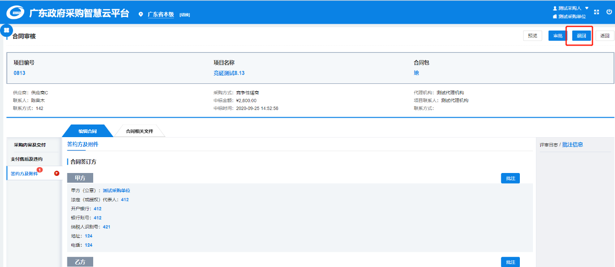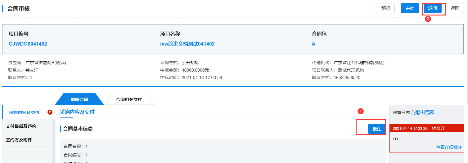 查看合同详情,确认无异议后(有异议时,对有异议的地方进行批注,然后点击退回,如图一),点击【审批】,填写处理审批备注内容(可不填),然后点击【确定】提交至合同归档环节,如图二。