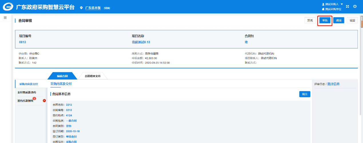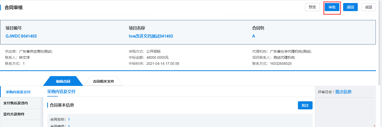 **步骤二:**若审批没问题,点击【审批】进行合同归档