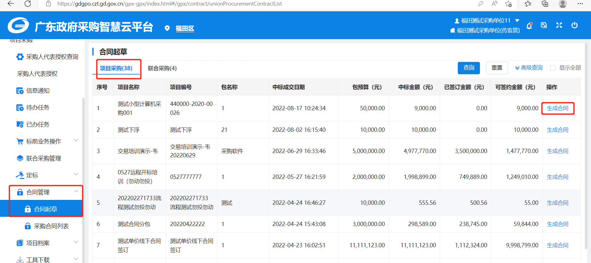 步骤一:365bet登录_365bet.com亚洲版_北海365信息分类人选择“合同管理→合同起草→项目365bet登录_365bet.com亚洲版_北海365信息分类”,选择待起草的项目,点击【生成合同】。