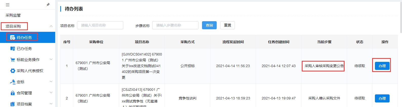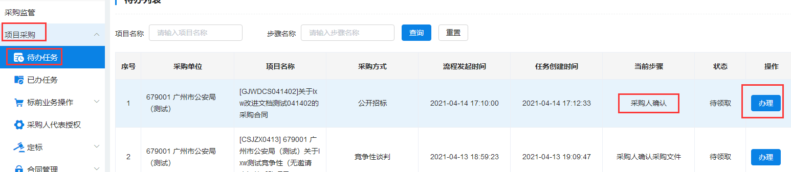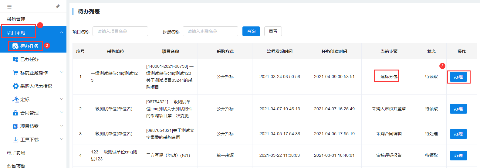 步骤一:点击“待办任务”菜单,找到待“建标分包”的项目,点击【办理】。
