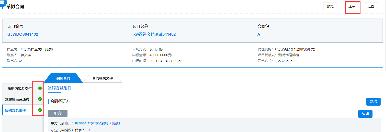 **步骤四:**将菜单列表里所有项目填写完毕后,全部提示为绿色,即可点击“送审”按钮进行送审