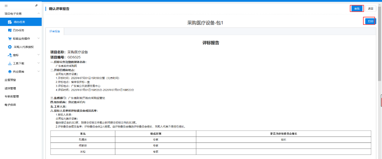 对评标报告进行打印,点击【审批】,填写处理审批备注内容(可不填),点击【确定】完成审批并提交到下一环节(代理机构起草中标公告)。