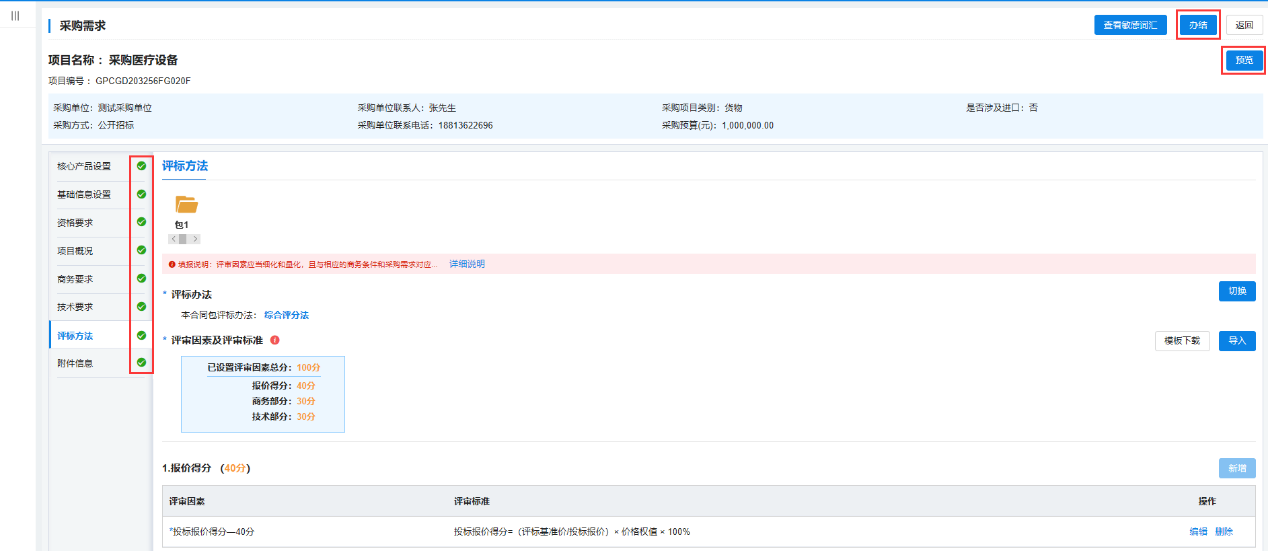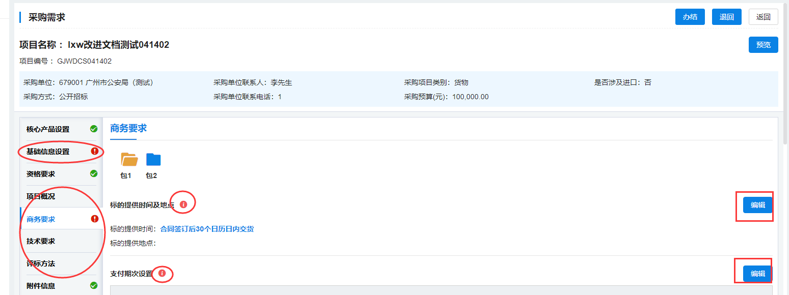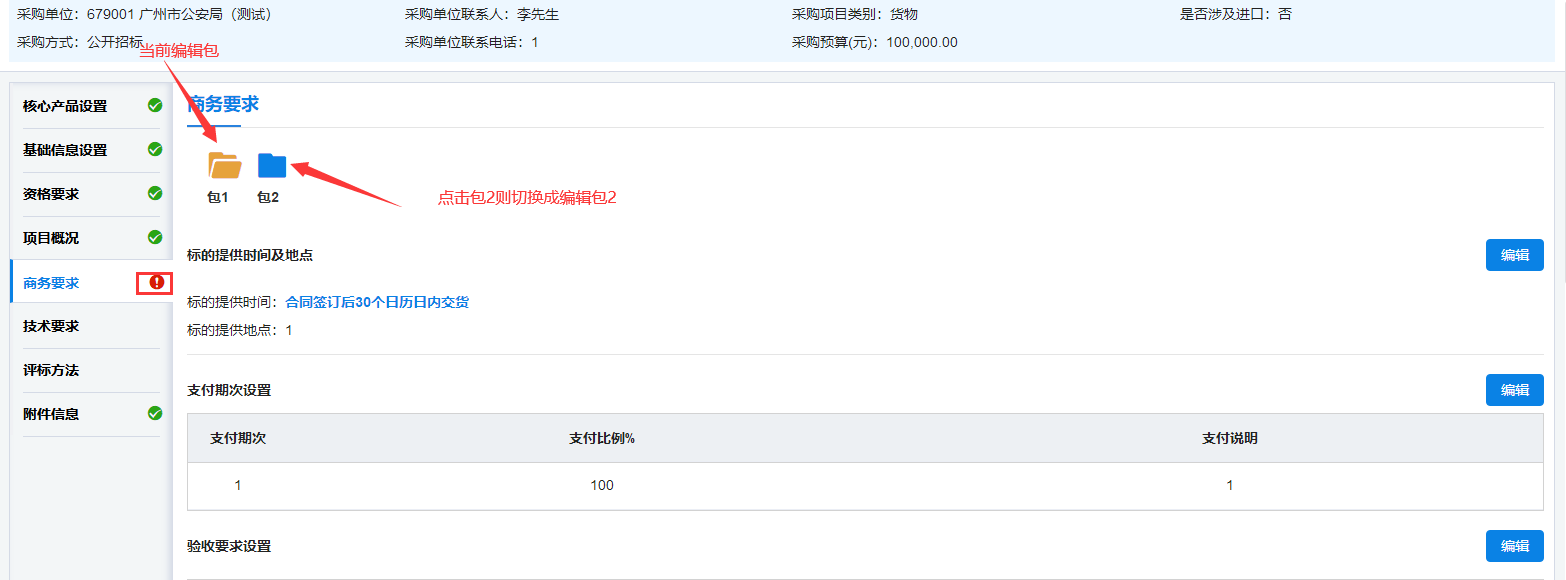 **步骤三:**365bet登录_365bet.com亚洲版_北海365信息分类人必须对“基础信息设置”、“项目概况”、“技术/商务要求”、“评标方法”等无“绿色√”标识模块中带有红点的内容进行编辑,其他信息也可进行查看。