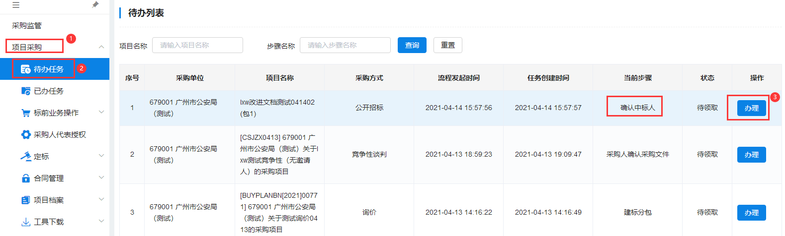 **步骤一:**点击“项目365bet登录_365bet.com亚洲版_北海365信息分类--待办任务”菜单,找到待“确认中标人”的项目,点击【办理】(一个项目多个包时需要多次确认中标人)。