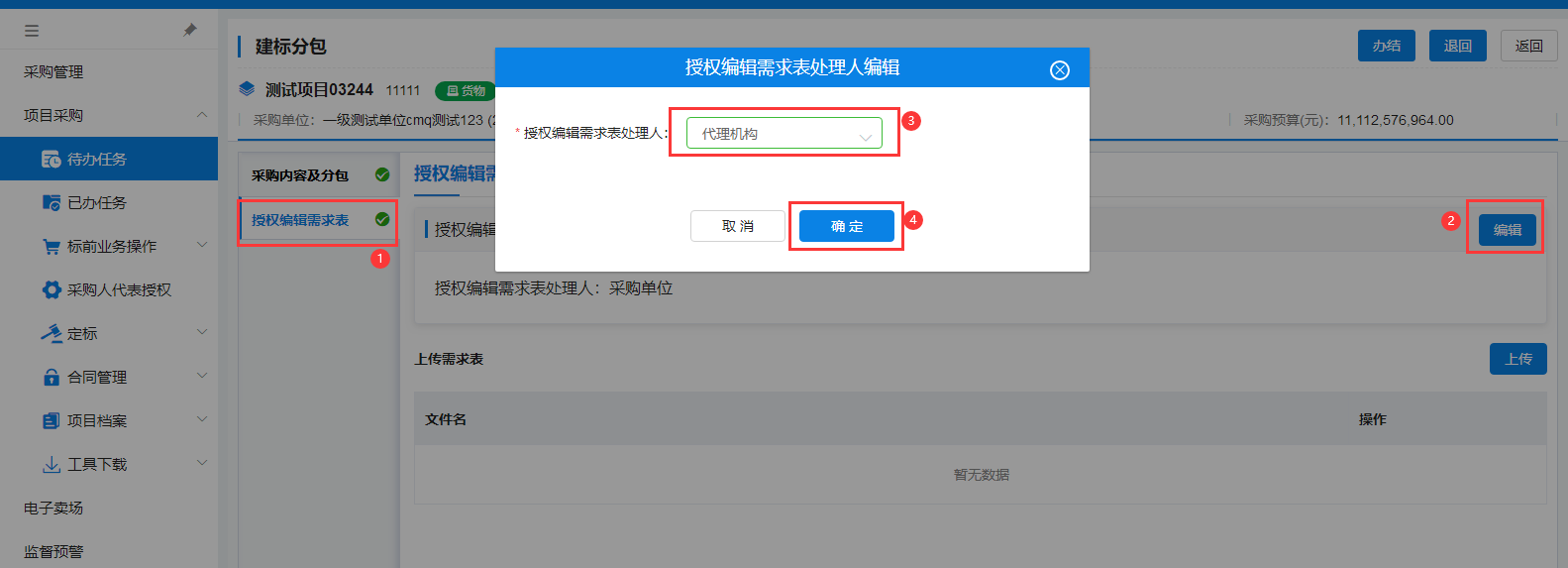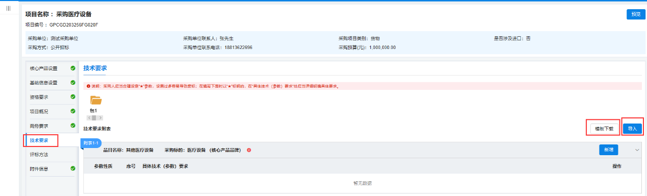 说明:“技术要求、评标方法”支持模板批量导入,也可以手动编辑新增。