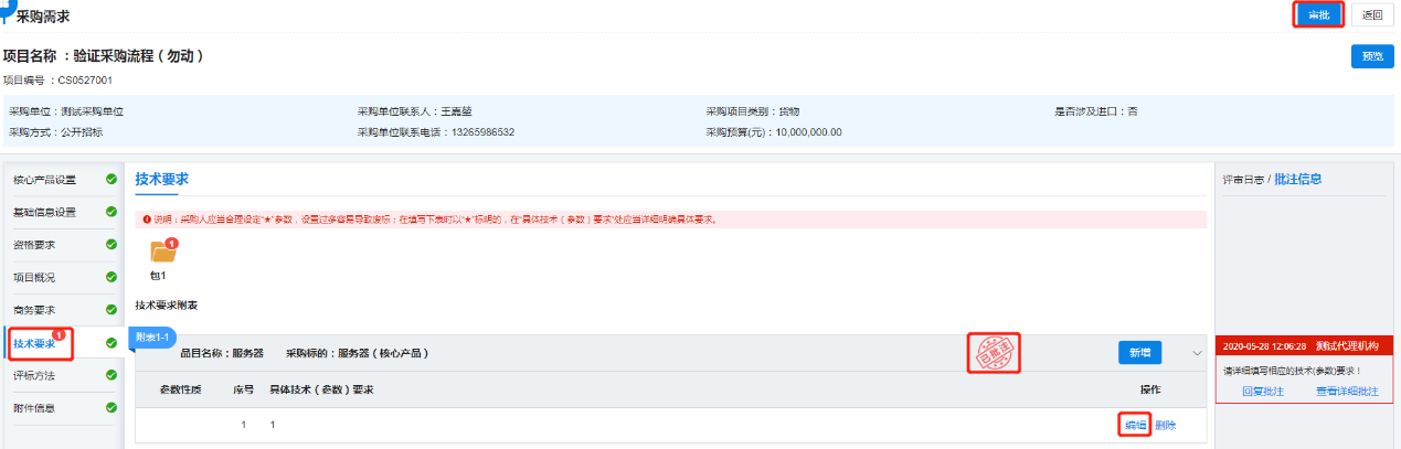 步骤二:点击左侧带有批注标记的菜单,对批注的内容进行调整。内容确认无误后,点击“审批”,提交至代理机构再次确认。