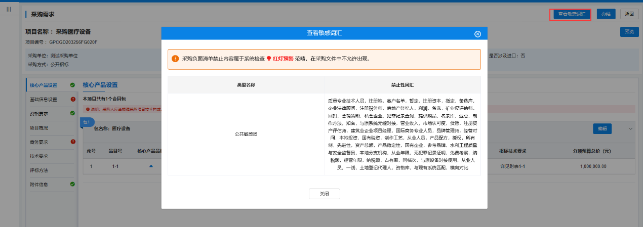 温馨提醒:该环节系统设置了敏感词汇检测,点击【查看敏感词汇】(图一),可以查看敏感词汇集,365bet登录_365bet.com亚洲版_北海365信息分类人要避开此类敏感词汇的使用,如果继续使用此类敏感词汇时,系统将检测出并以红色字体提示;若项目含有多个包,则在商务要求、技术要求、评标方法需对每一个包进行编辑确认操作直至商务要求、技术要求、评标方法“绿色√”,如图二。