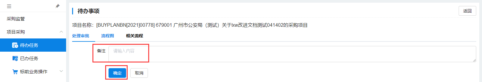 步骤四:点击【办结】弹出如下操作框,可以在“处理审批”的备注对话框内输入备注信息,没有则无需输入(图1);点击【流程图】,可以查看各个环节的流程节点。点击【相关流程】可以展示系统以文字记录的流程信息,最后点击【确定】进入编制365bet登录_365bet.com亚洲版_北海365信息分类需求表环节(新流程支持365bet登录_365bet.com亚洲版_北海365信息分类人是否委托给代理机构编制365bet登录_365bet.com亚洲版_北海365信息分类需求表(图2),如果选择自己编制365bet登录_365bet.com亚洲版_北海365信息分类需求表,流程到自己操作环节)。