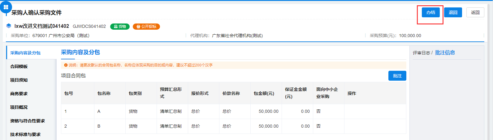确认无误后,点击【办结】,填写处理审批备注内容(可不填),点击【确定】提交给代理机构再次确认。