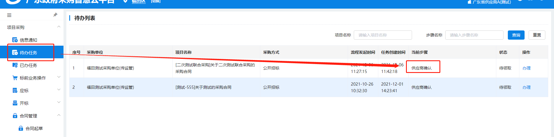 **步骤一:**请依次选择“项目365bet登录_365bet.com亚洲版_北海365信息分类→待办任务”,找到待“供应商确认”的项目,点击【办理】。