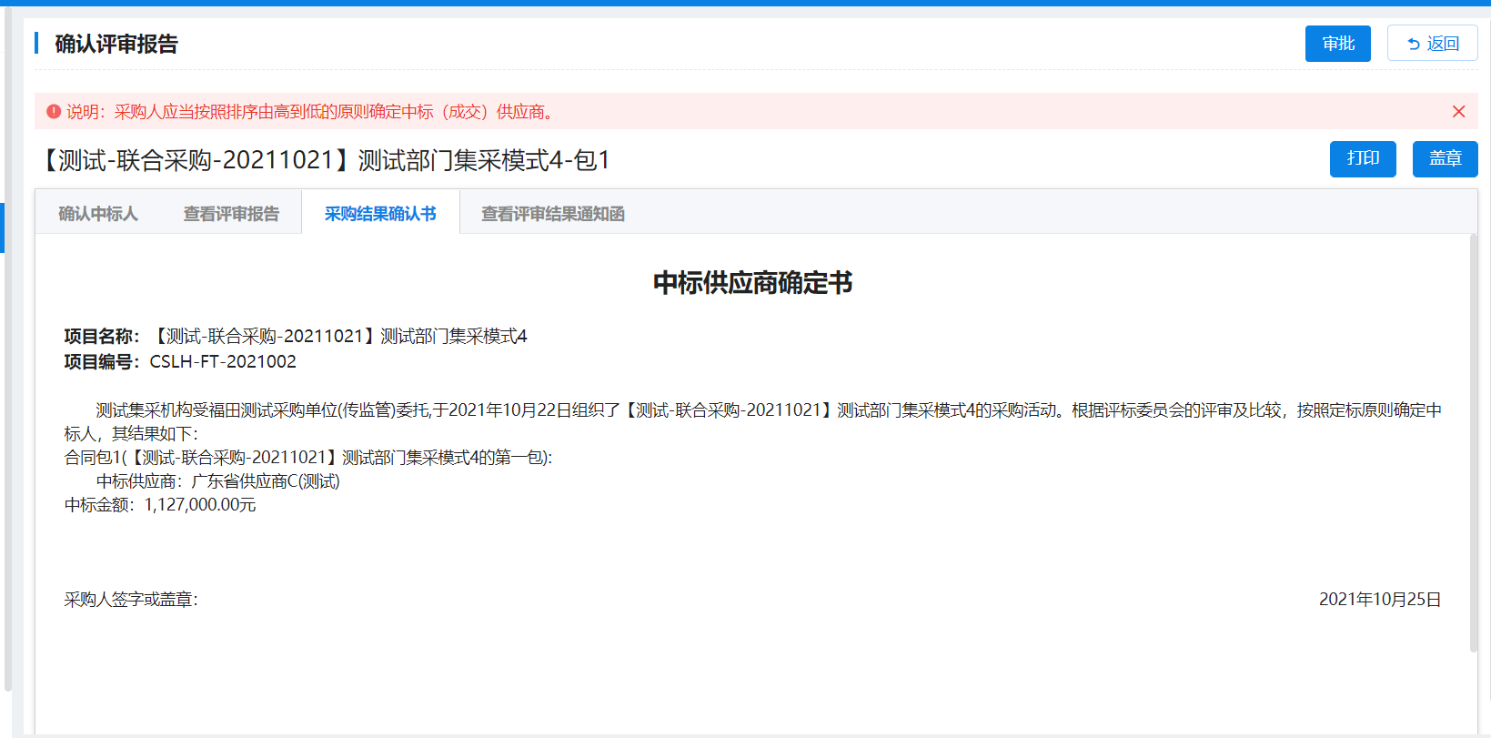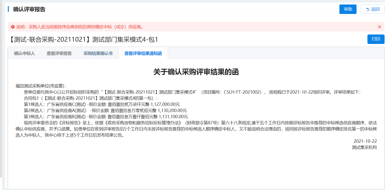 对《评审报告》进行打印,点击【审批】,填写备注(可不填),点击【确定】,进入草中标公告环节。