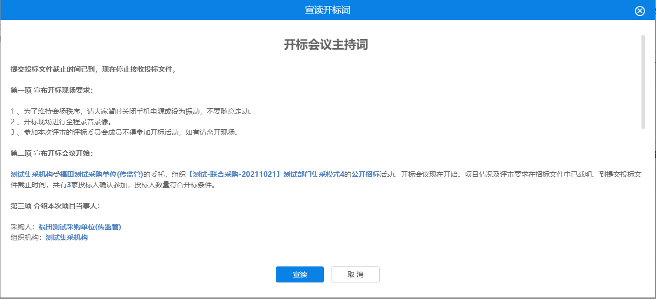 查看各供应商开标情况,确认无误后点击【退出】按钮,则表示开标完成,该过程根据实际情况打印开标过程表,如下图所示: