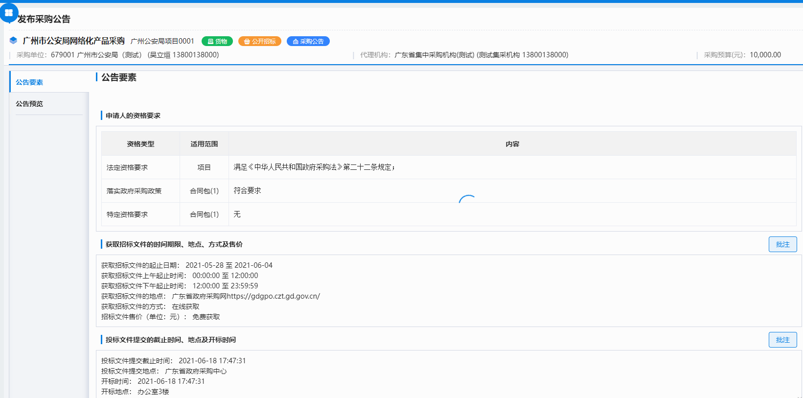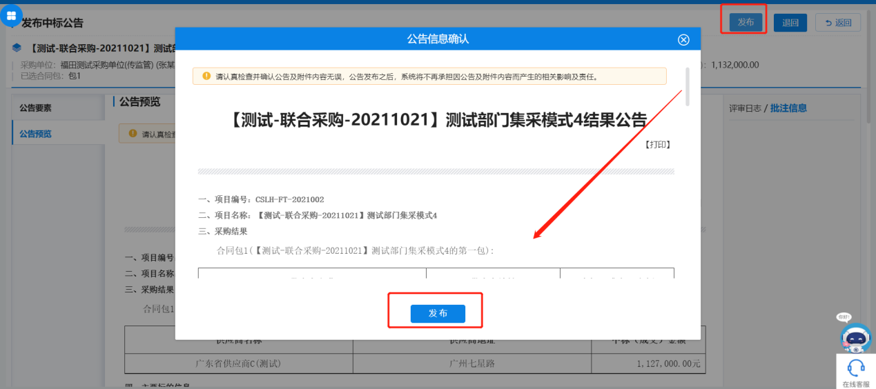 步骤二:点击【发布】,发布中标公告,公告将推送至门户。