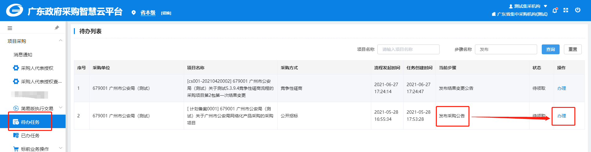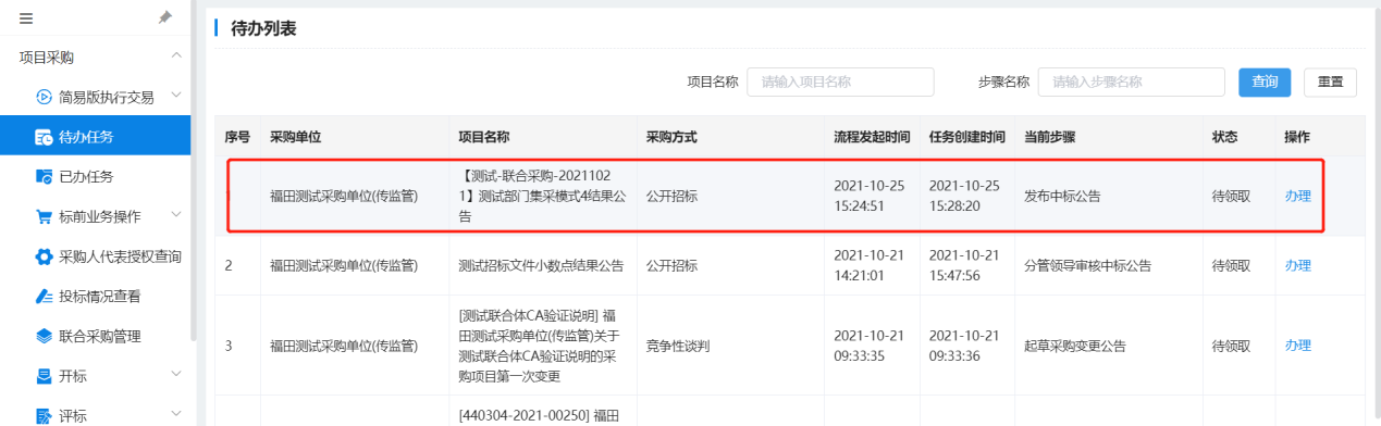 步骤一:请依次选择“项目365bet登录_365bet.com亚洲版_北海365信息分类→待办任务”,找到待“发布中标公告”的项目,点击【办理】。
