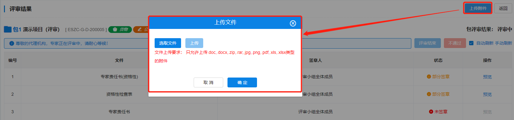 步骤三:若存在其他评审过程中产生的过程文件,也可以通过系统的【上传附件】按钮上传相关文件。