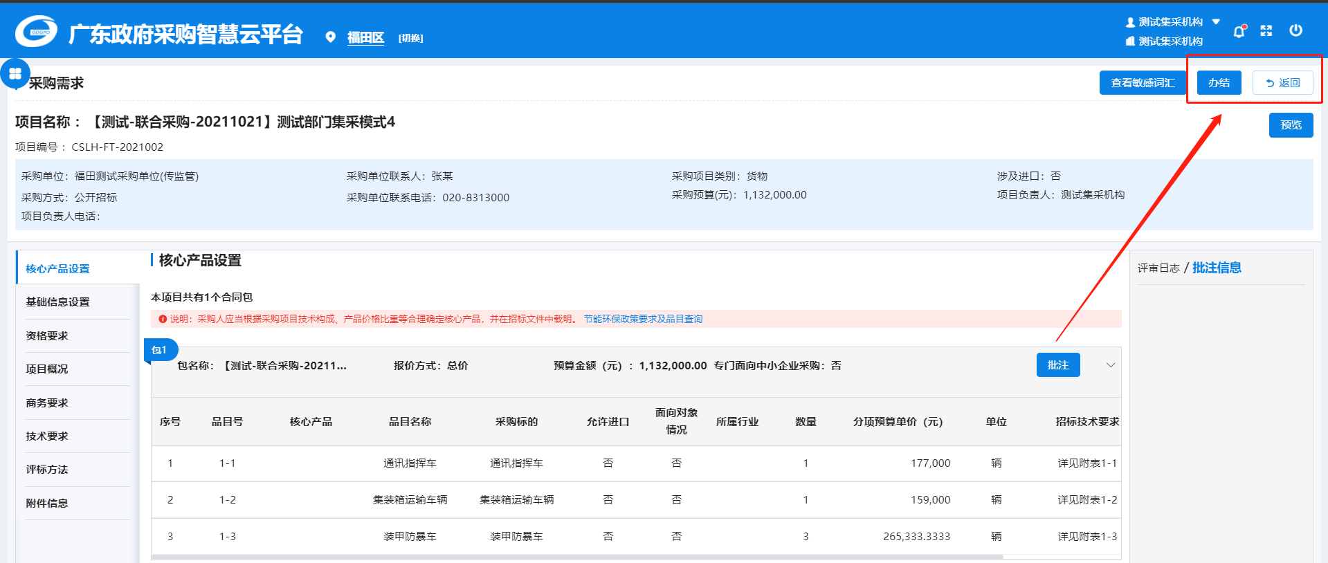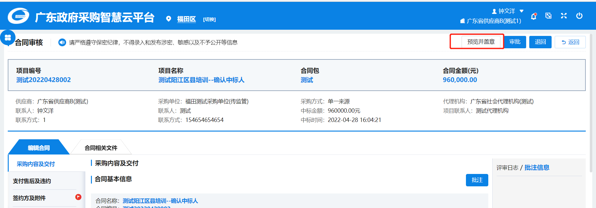 【退回】:退回到审核合同环节,有需要修改信息的需要先对细项进行批注再退回
