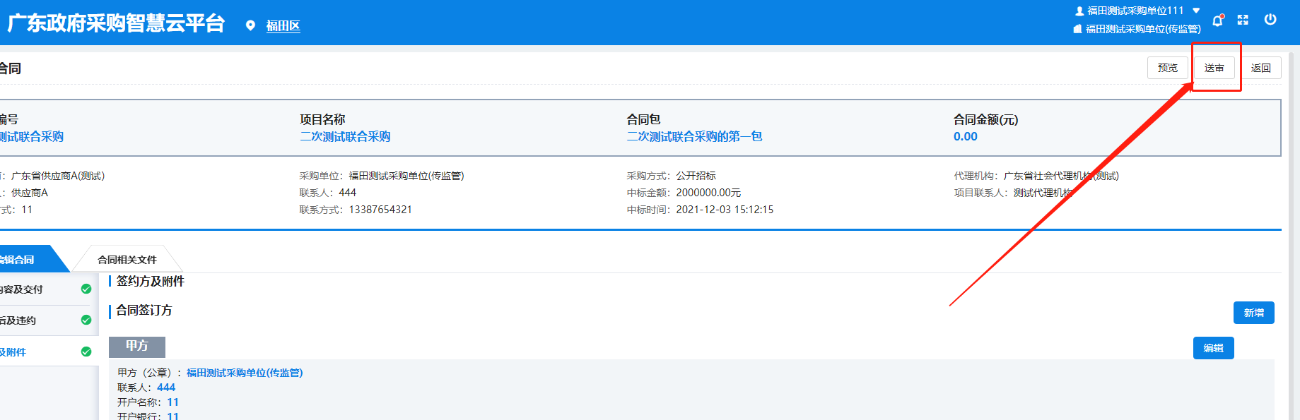 **步骤四:**所有项目填写完毕后,全部提示为绿色,点击【送审】,进行合同审核