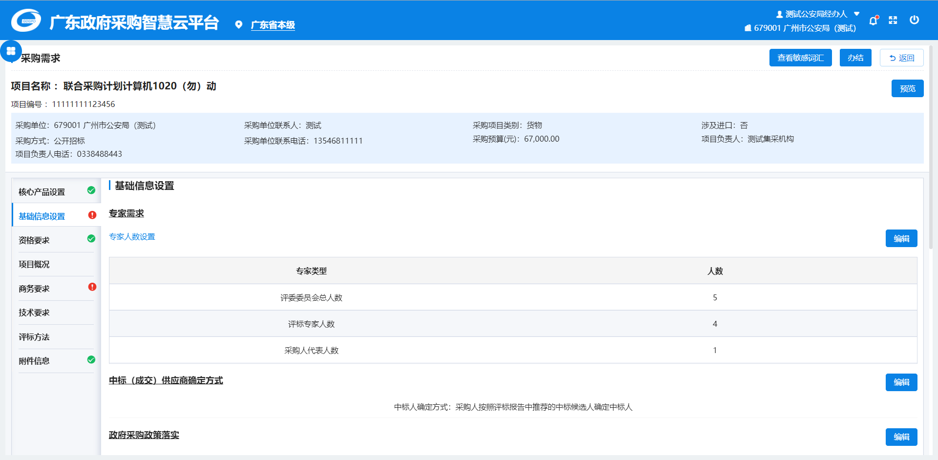 **步骤二:**补充基础信息设置、资格要求、项目概况、技术/商务要求、评标方法等无“绿色√”标识模块中的内容。
