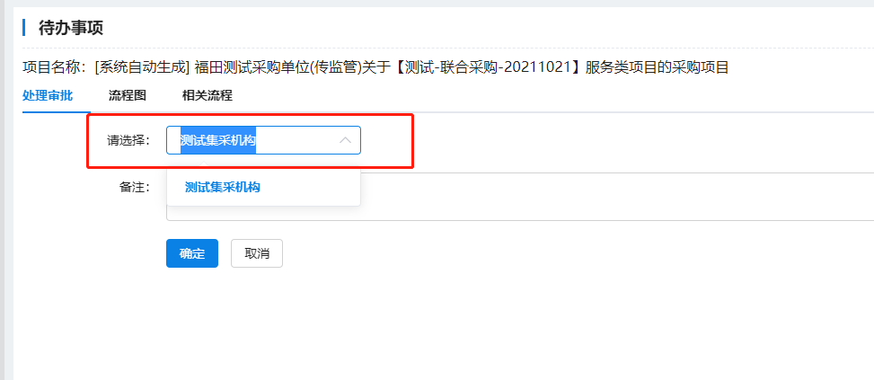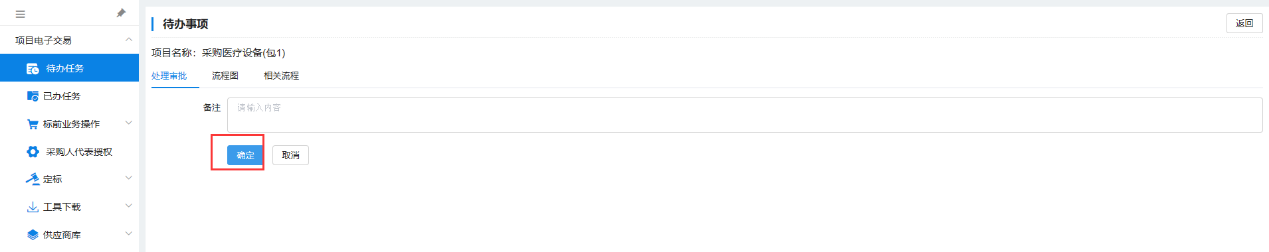 如果没有问题可以直接点击【审批】按钮,填写处理审批备注内容(可不填),然后点击【确定】提交至下一环节(供应商确认)。