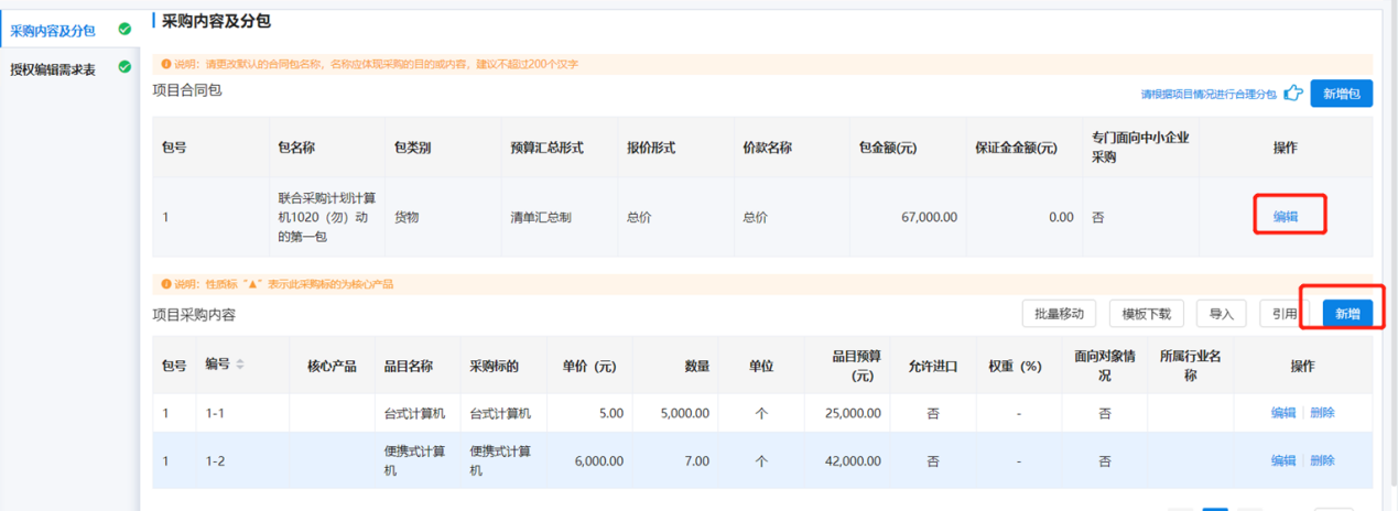 **温馨提示:**在建标分包环节,针对相同品目类型与商品名称的标的系统将自动进行数量、标的预算的合并。