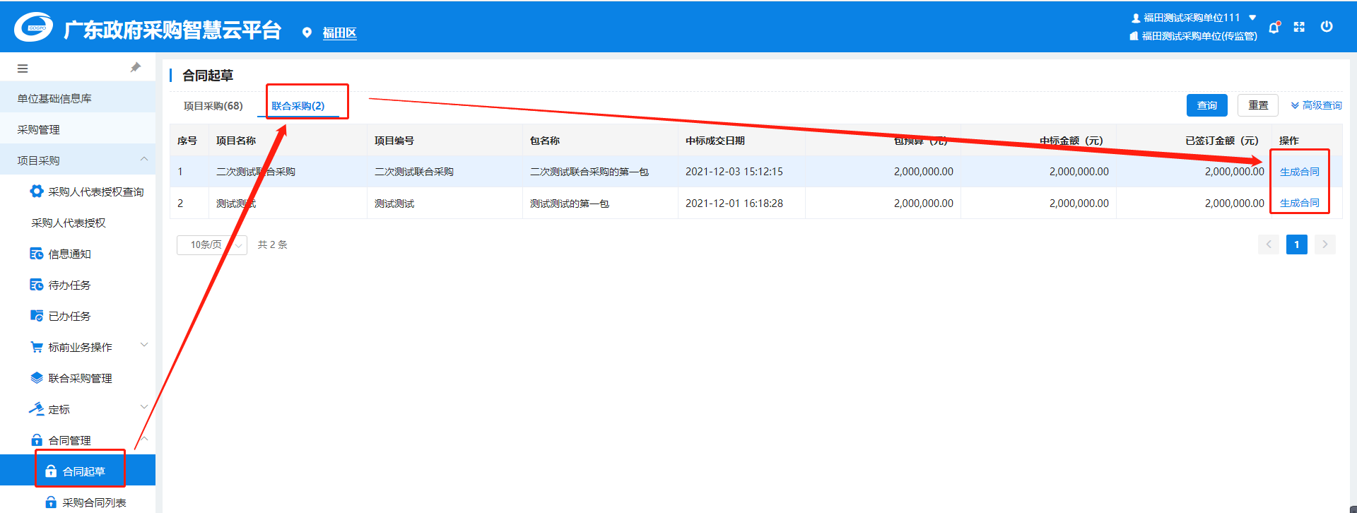 步骤一:365bet登录_365bet.com亚洲版_北海365信息分类人或供应商请依次选择“合同管理→合同起草→联合365bet登录_365bet.com亚洲版_北海365信息分类”,选择待起草的项目,点击【生成合同】。