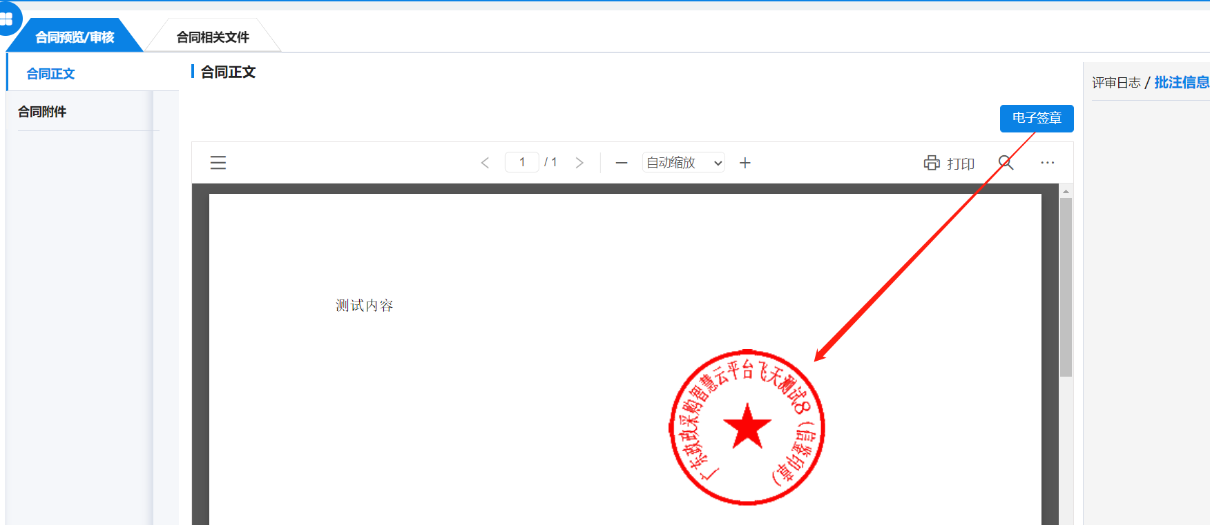 **步骤二:**页面右上角点击预览并盖章按钮点击电子签章输入密码选择盖章页数类型盖章成功。