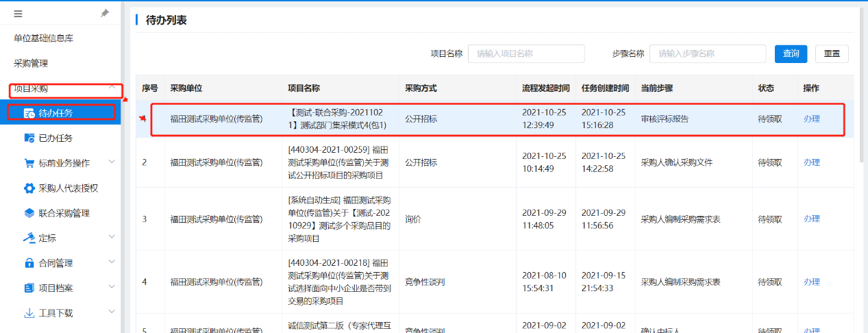 **步骤四:**点击“项目365bet登录_365bet.com亚洲版_北海365信息分类→待办任务”,找到待“审核评标报告”的项目,点击【办理】。