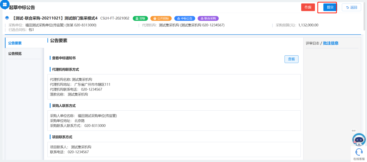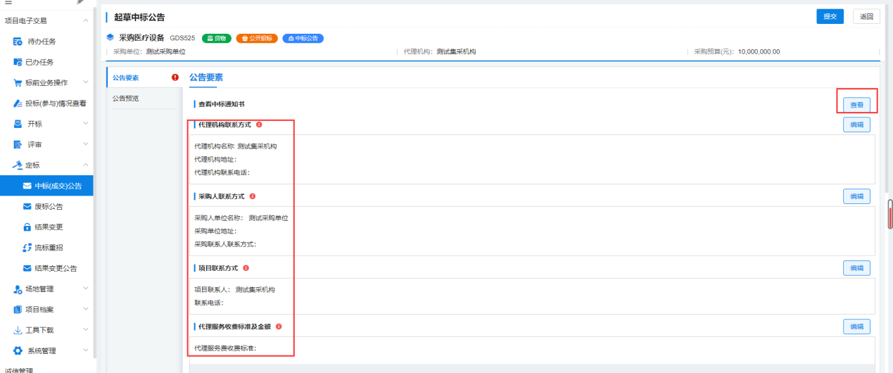 步骤三:对公告内容进行编辑确认,公告内容依据模板自动生成,确认无误后,点击【提交】,进入下一环节。