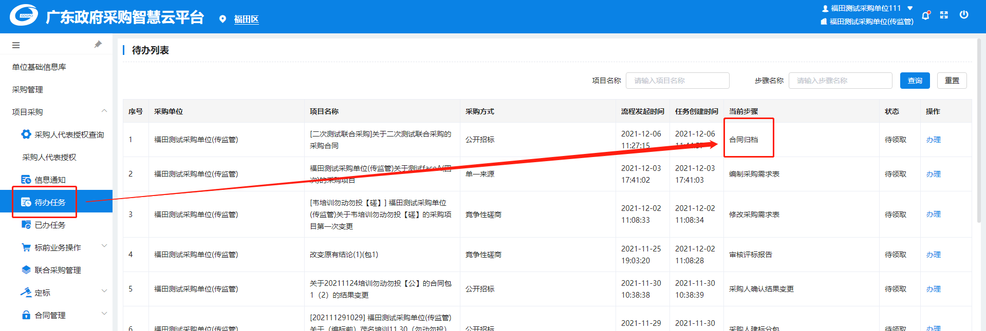 **步骤一:**请365bet登录_365bet.com亚洲版_北海365信息分类人依次选择“项目365bet登录_365bet.com亚洲版_北海365信息分类→待办任务”,找到待“合同归档”的项目,点击【办理】。