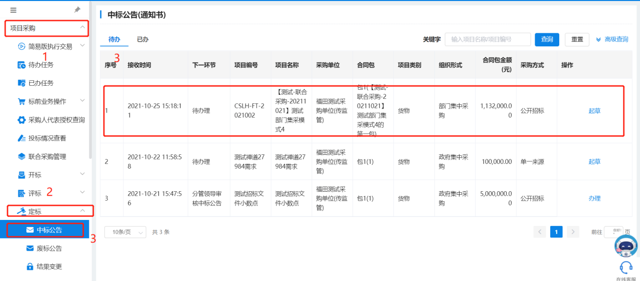步骤一:请依次选择“项目365bet登录_365bet.com亚洲版_北海365信息分类→定标→中标公告”,找到待“起草/发布中标公告”的项目。点击【起草】,勾选合同包点击【确定】。