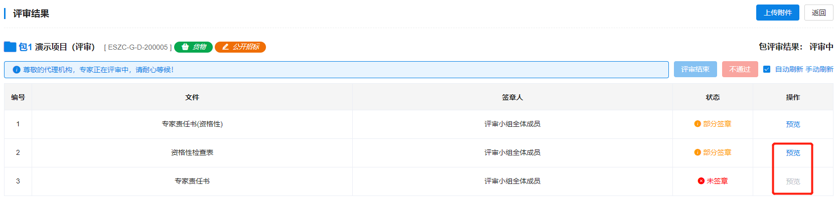 步骤一:《评审结果》经评审委员会全体成员确认通过后,点击【预览】。