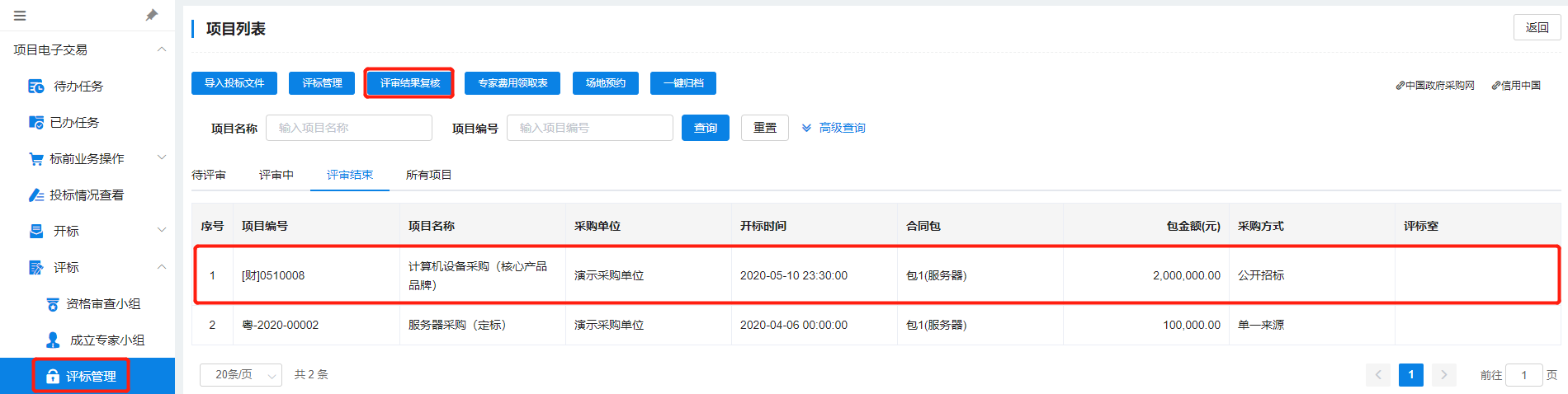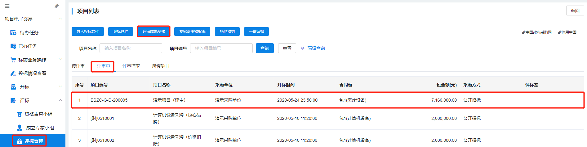 步骤一:请依次选择“项目365bet登录_365bet.com亚洲版_北海365信息分类→评标→评标管理”,选中项目,点击【评审结果复核】。