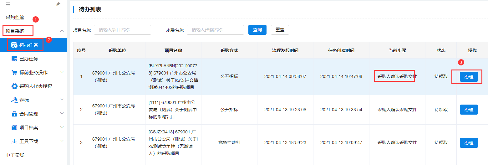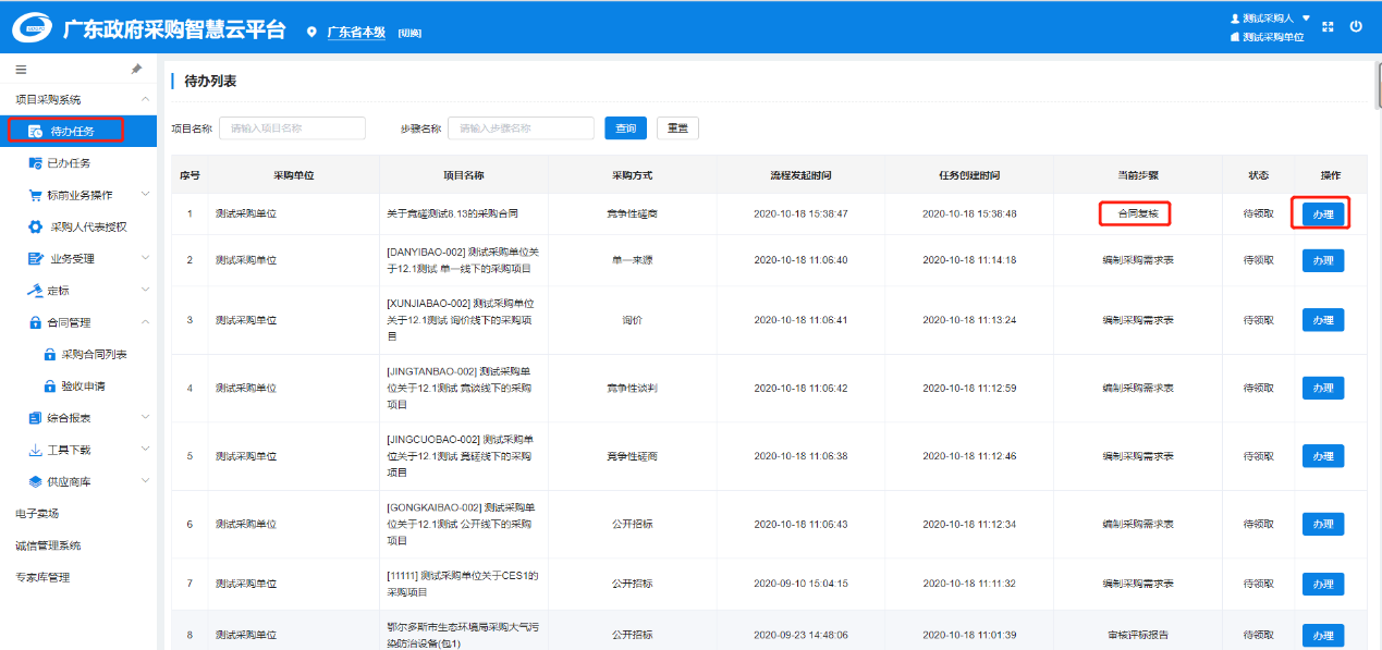 步骤一:点击“待办任务”菜单,找到待“建标分包”的项目,点击【办理】。