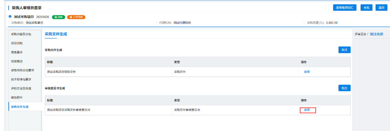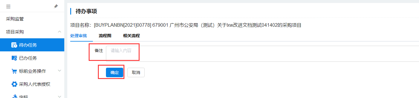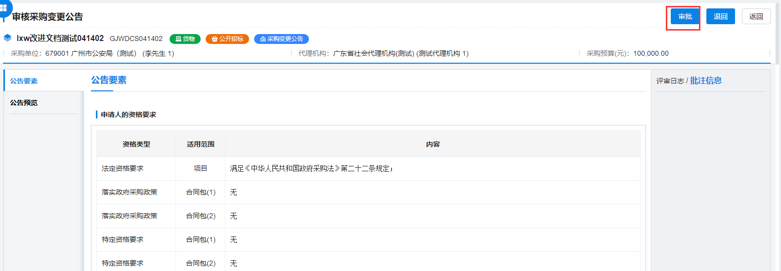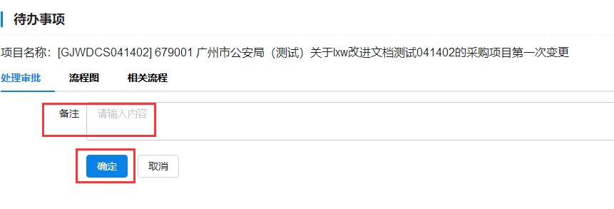 步骤二:确认公告内容无误后,点击【审批】,填写处理审批备注内容(可不填),点击【确定】提交至下一环节(代理机构)。