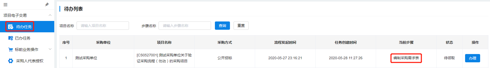 步骤一:点击“项目365bet登录_365bet.com亚洲版_北海365信息分类-待办任务”菜单,找到待“编制365bet登录_365bet.com亚洲版_北海365信息分类需求表”的项目,点击【办理】。