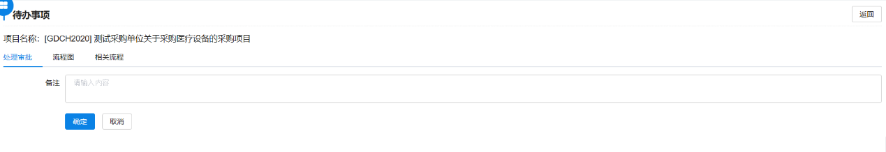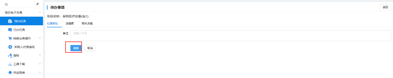 如果没有问题可以直接点击【审批】按钮,填写处理审批备注内容(可不填),然后点击【确定】提交至下一环节(供应商确认)。