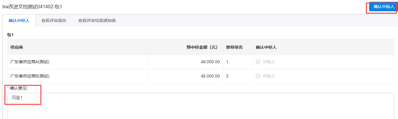 点击【确认】中标供应商,并且填写“确认意见”,点击【确认中标人】后生成【365bet登录_365bet.com亚洲版_北海365信息分类结果确认书】。