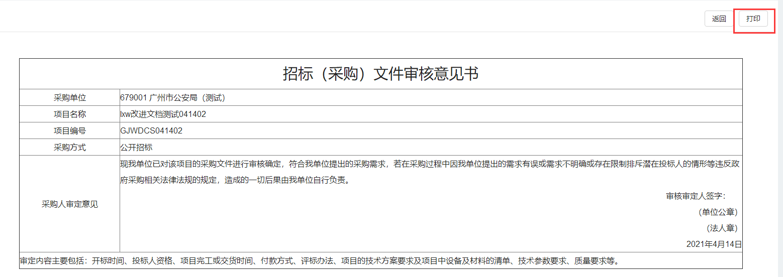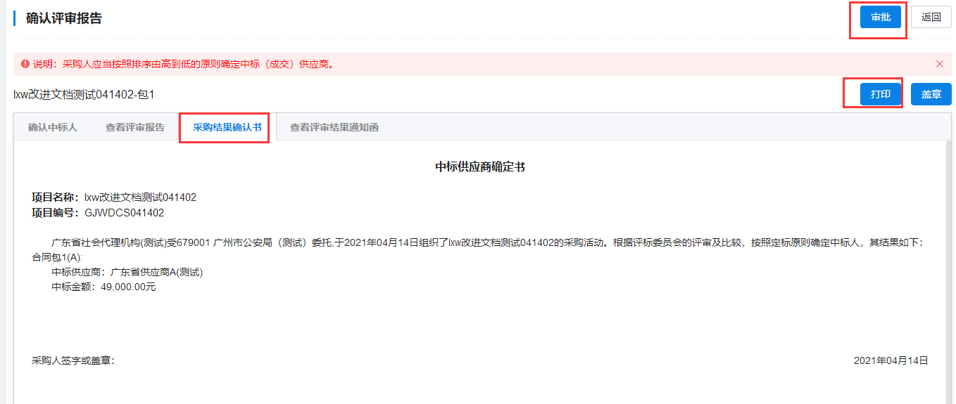 对评标报告进行打印,点击【审批】,填写处理审批备注内容(可不填),点击【确定】完成审批并提交到下一环节(代理机构起草中标公告)。