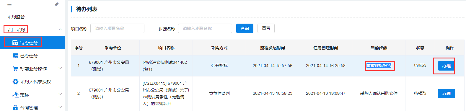 点击“项目365bet登录_365bet.com亚洲版_北海365信息分类--待办任务”菜单,找到待“审核评标报告”的项目,点击【办理】。
