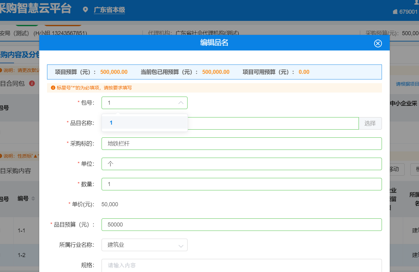 点击新增按钮,转跳至编辑品名界面,选择包号,录入品目明细(但是总价不能大于包金额)