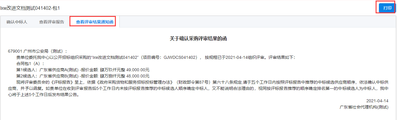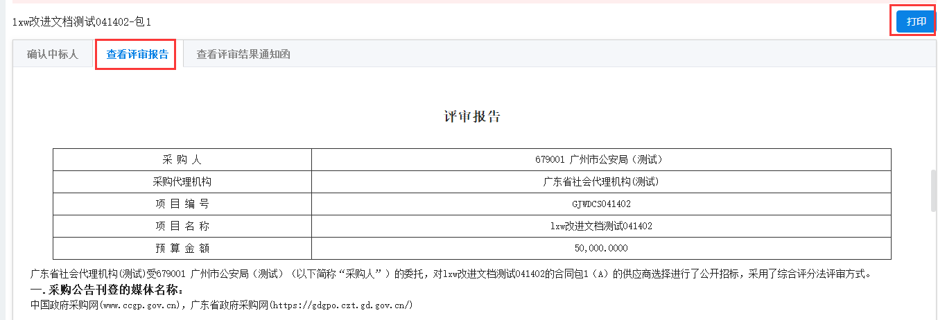 **步骤二:**查看《评审报告》、《评审结果通知函》,可以进行打印。