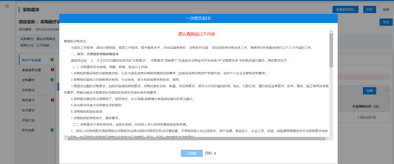 **步骤二:**请365bet登录_365bet.com亚洲版_北海365信息分类人认真阅读《一次性告知书》,系统默认时间强制为1分钟。时间截止后,点击【已阅读】,然后进行365bet登录_365bet.com亚洲版_北海365信息分类需求的编写。