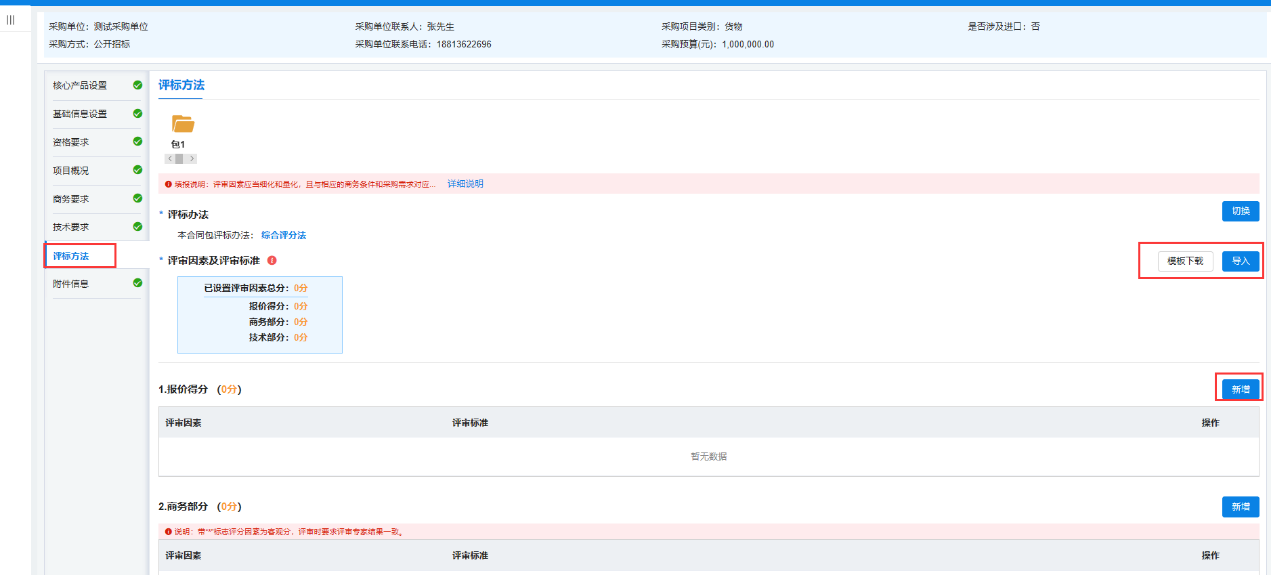说明:“技术要求、评标方法”支持模板批量导入,也可以手动编辑新增。