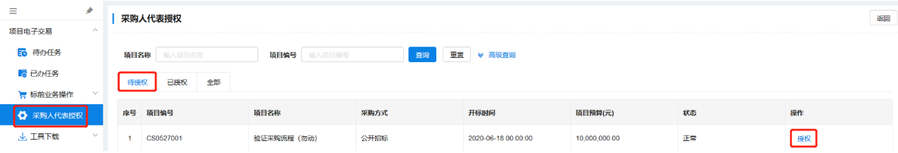 **步骤一:**点击“365bet登录_365bet.com亚洲版_北海365信息分类人代表授权”菜单,选择“待授权”,找到待“授权365bet登录_365bet.com亚洲版_北海365信息分类人代表”的项目,点击【授权】。