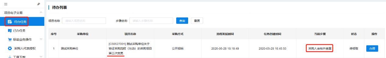 步骤一:点击“项目365bet登录_365bet.com亚洲版_北海365信息分类--待办任务”菜单,找到待“365bet登录_365bet.com亚洲版_北海365信息分类人审核365bet登录_365bet.com亚洲版_北海365信息分类变更公告”的项目,点击【办理】。