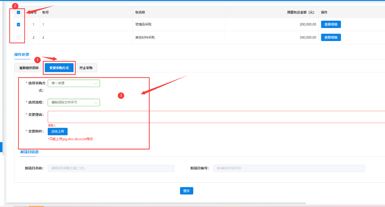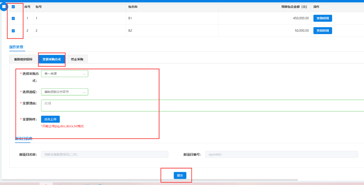 **步骤二:**在流标重招界面选择“变更365bet登录_365bet.com亚洲版_北海365信息分类方式”的流标方式,勾选需要变更365bet登录_365bet.com亚洲版_北海365信息分类方式的包(同一个项目可选单个包或者多个包),选择好一种方式后,上传相应附件文件,填写“变更理由”,完成后点击【提交】按钮。如下图所示: