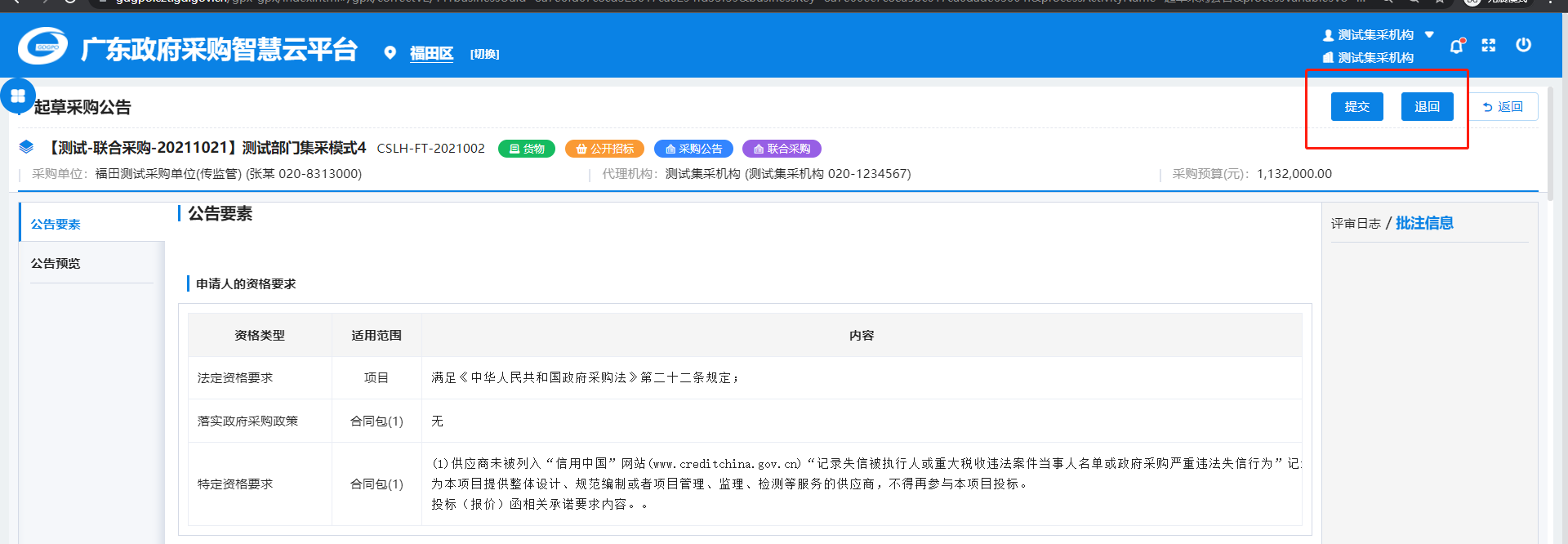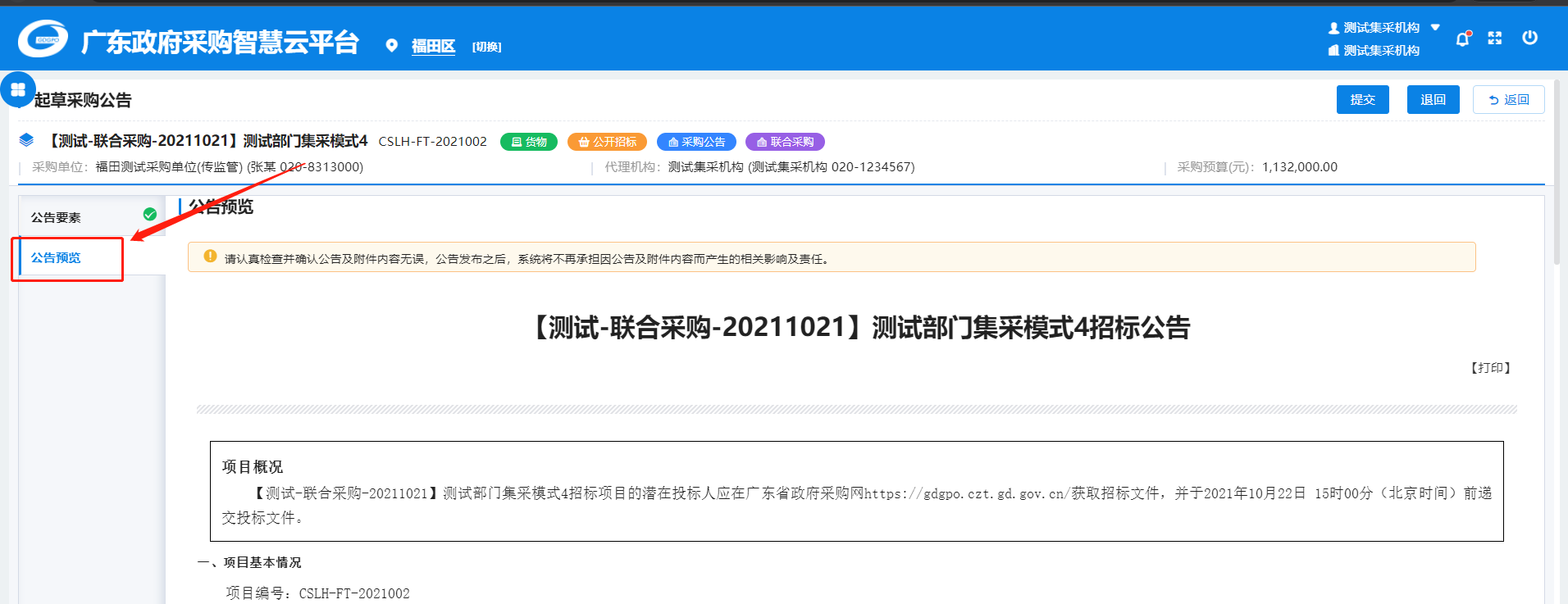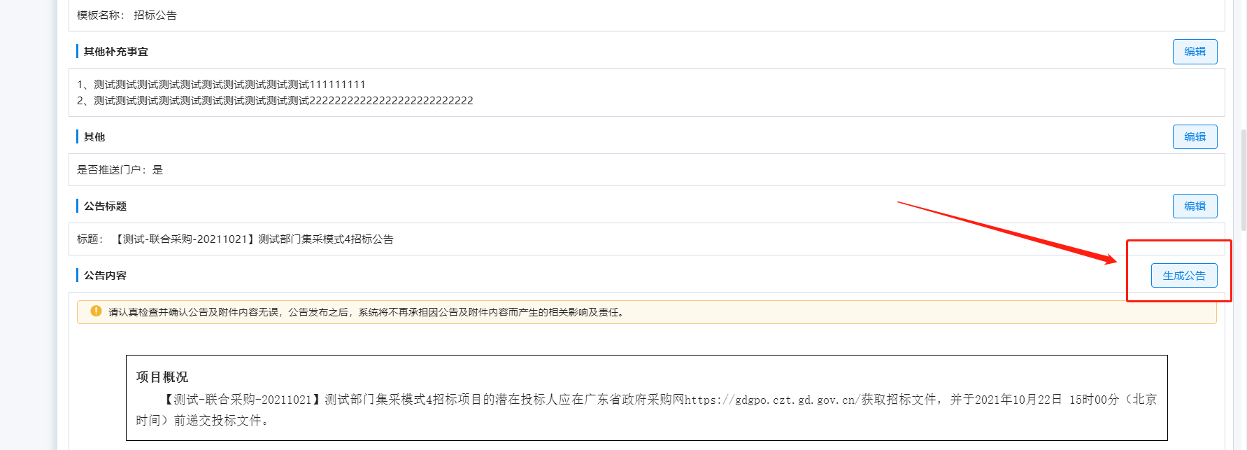 步骤三:对公告内容进行编辑确认,公告内容依据模板自动生成,确认无误后,点击【提交】,进入下一环节。