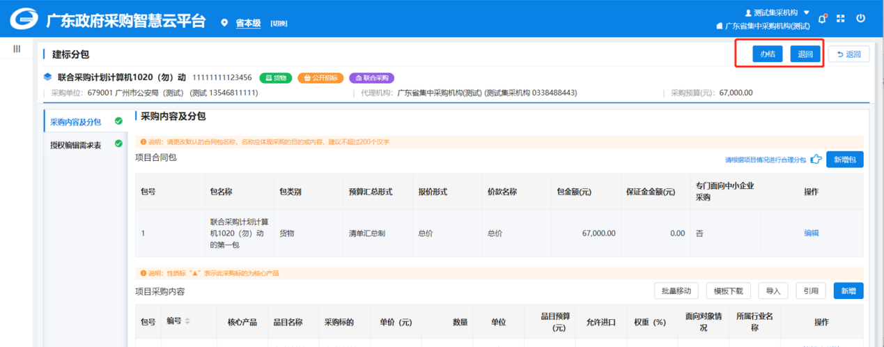 **温馨提示:**在建标分包环节,针对相同品目类型与商品名称的标的系统将自动进行数量、标的预算的合并。